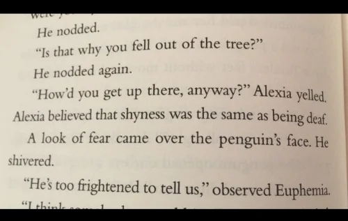 This story also takes a really good look at what it’s like to have a disability. Holly can’t go outside in warm weather because it will actually kill her. Her heart will melt, and she will die. She has to take precautions inside her own home (no fires, no warm breezes from the outside, no blankets) for the same reason. She has a conversation with a sick little girl, and they understand one another because the little girl has to stay warm to get better. And it’s not handled with kid gloves. It’s right out there: this is a thing that happens in the world. Different people have different needs. As this is a children’s book, I think that’s such a great way to open up that conversation with children. “That little girl doesn’t have any hair because the medicine she needs makes it fall out. That little boy is in a wheelchair because some people need them to get around.” As someone who once had tube hanging out of her chest as a child, I appreciate this.