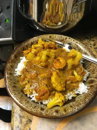 Heat a large straight sided sauté pan or medium pot over medium heat. Add oil. When it begins to shimmer, toss in onions and salt to taste. Sauté onions until they are soft, golden, and smell delicious, about 12 minutes. If using chicken, add now and add a little more salt. Cook chicken thighs until nearly done, 15 minutes. Add tomatoes and all the spices. Stir well to combine and increase heat to medium-high. Bring to a simmer and cook until tomatoes begin to thicken, 10 to 15 minutes. Add the vinegar, cauliflower, and coconut milk. Bring back to a simmer and cook for 10 to 15 more minutes or until everything has thickened and the cauliflower is fork tender. Stir often to prevent burning on the bottom of your pan. If using shrimp, add during the last 5 minutes of cooking and cook through. Serve over hot rice and top with cilantro to garnish.