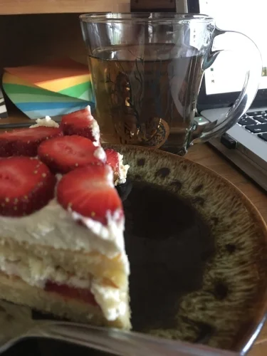 Currently drinking: Jasmine green tea with a slice of homemade Victoria sponge cake, made with fresh strawberries the hubs and I picked the other day.