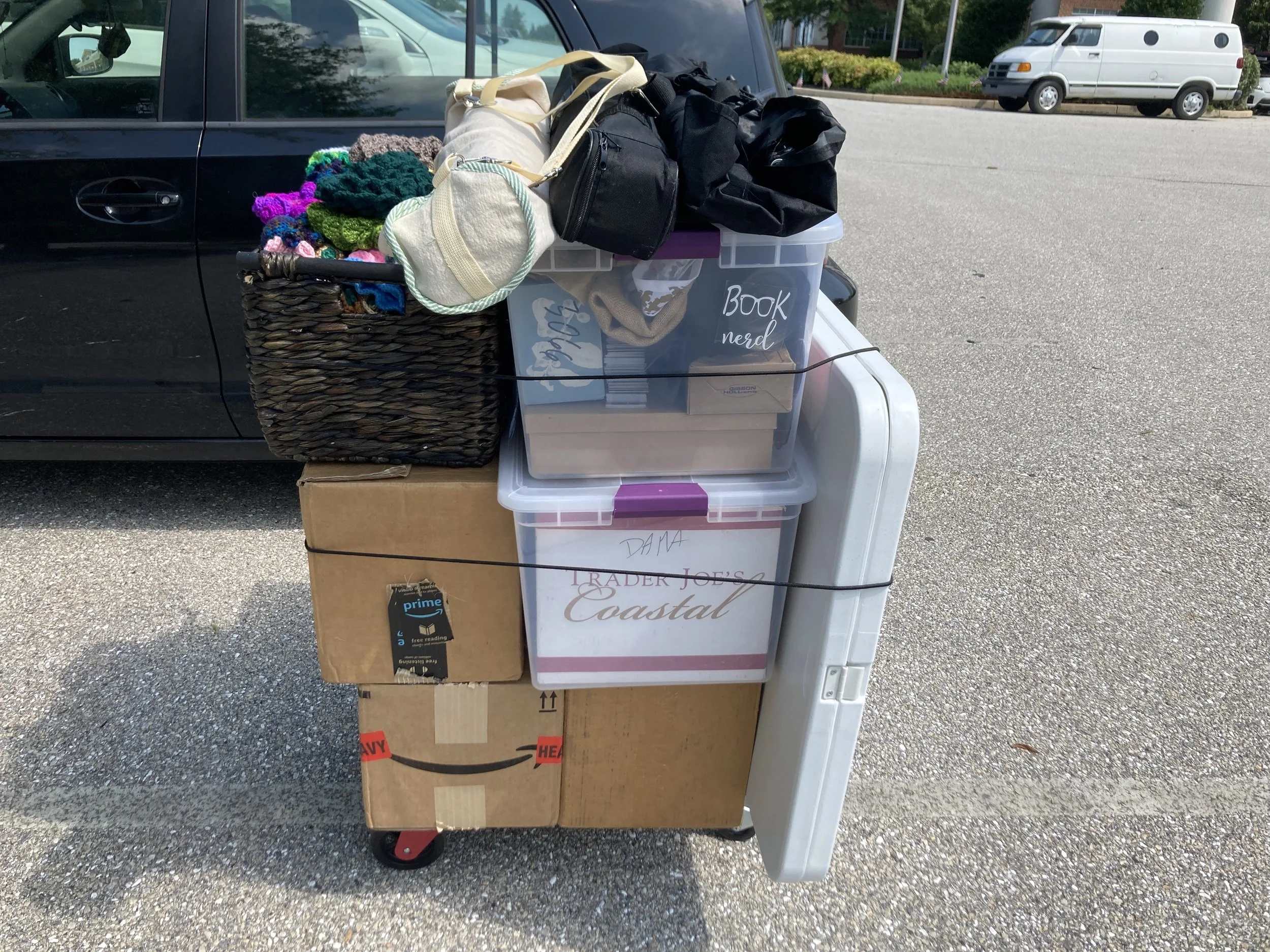 In mine, I usually have a container of trail mix, a water bottle, backup water bottle (hydrate thyself, ya’ll), protein bars, instant coffee and coffee fixings, and hand sanitizer. I might also have more snacks, the afore-linked boxes of soup, pens, plastic flatware, and anything else I might possibly need that day.